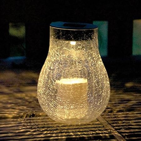 Solar Powered Crackle Glass Garden Table Lantern With Led Candle