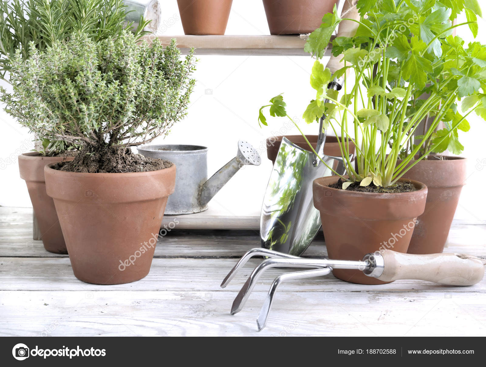 Aromatic Herbs Potted On A Garden Table Stock Photo Download
