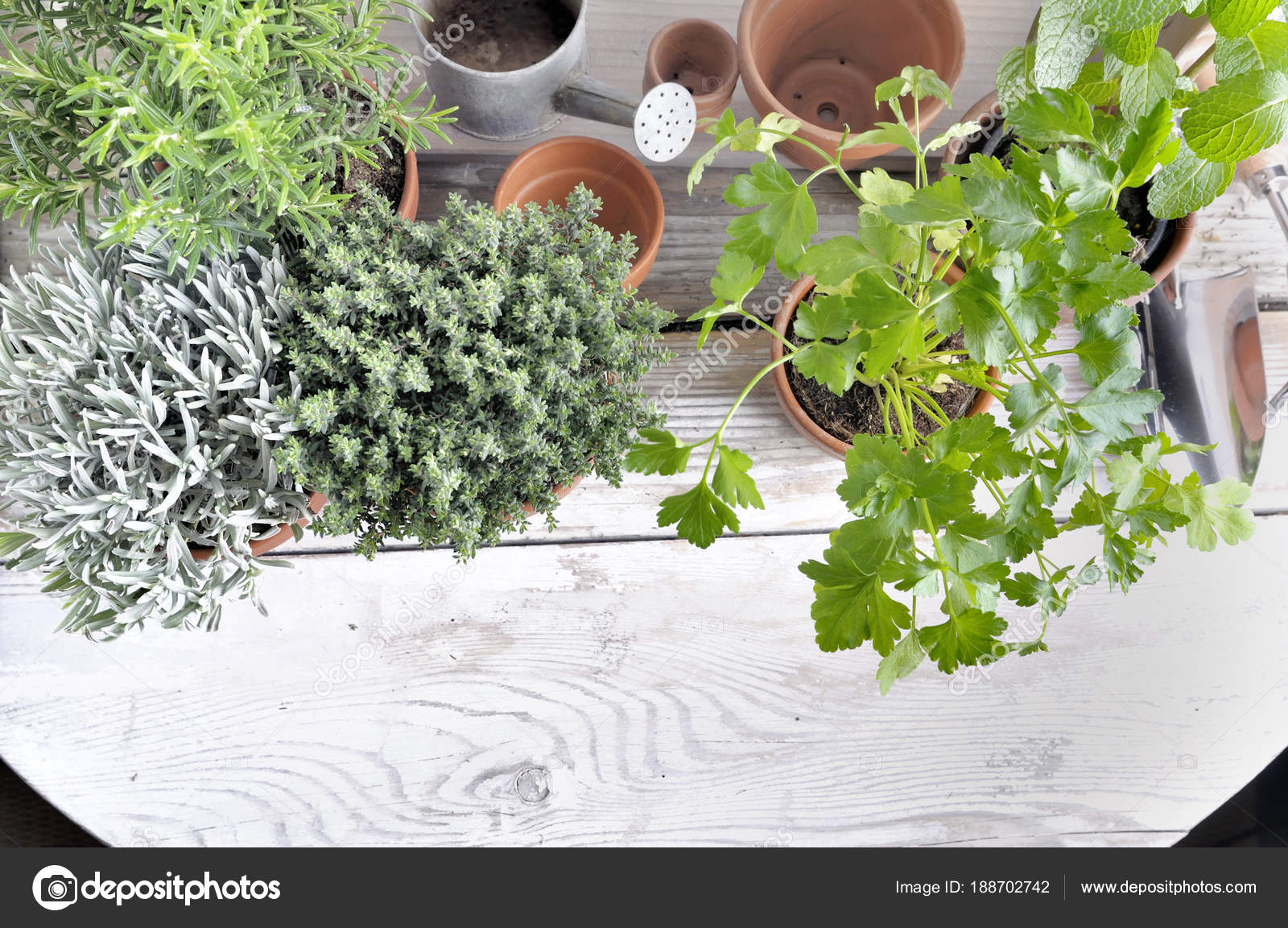 Aromatic Herbs Potted On A Garden Table Stock Photo Download