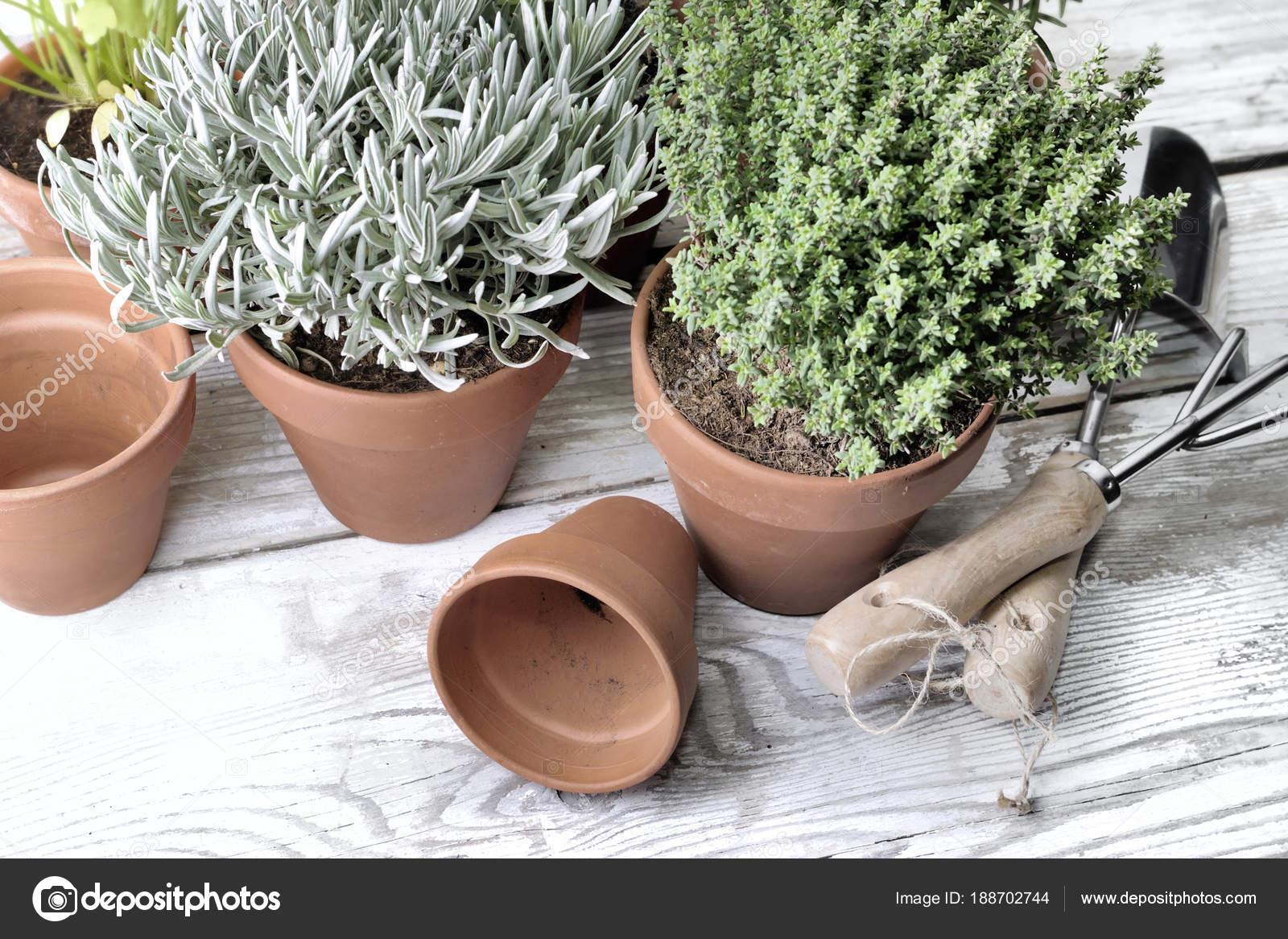 Garden Work Table With Potted Culinary Herbs Balls Of Twine Rake