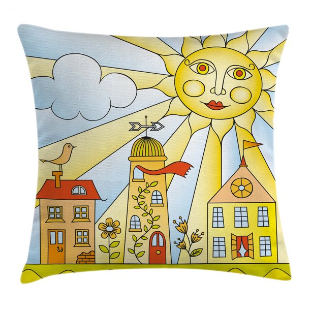 Kids Room Throw Pillow Cushion Cover Childlike Drawing Of City
